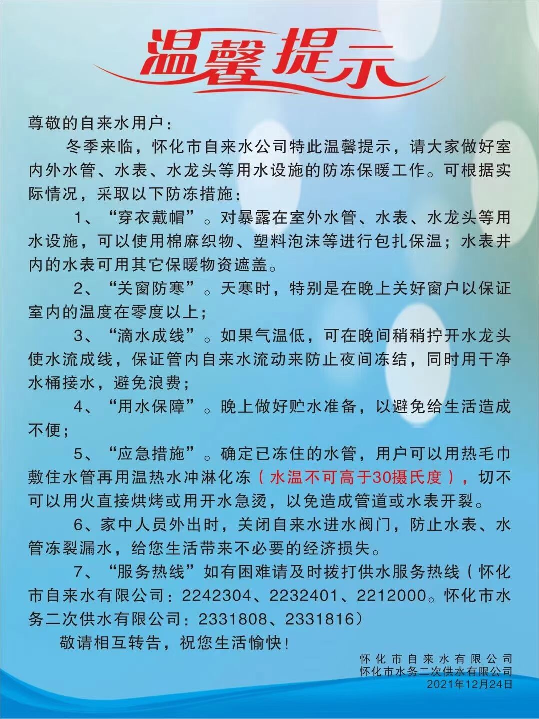 氣溫降至,溫馨提醒您做好供水設(shè)施防凍措施!
