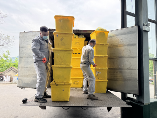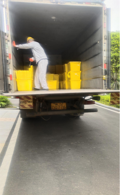 中午時分,烈日當(dāng)空,收運(yùn)車箱內(nèi)溫度高達(dá)40多度。穿著防護(hù)服的收運(yùn)人員,汗水止不住地流淌,很快就濕透了衣衫。但他們沒有半句怨言,“醫(yī)療廢物不能長時間存放,必須盡快轉(zhuǎn)運(yùn)處理,我們辛苦點(diǎn)沒關(guān)系,不能影響城市的安全”。一位年輕的轉(zhuǎn)運(yùn)職工堅定地說。